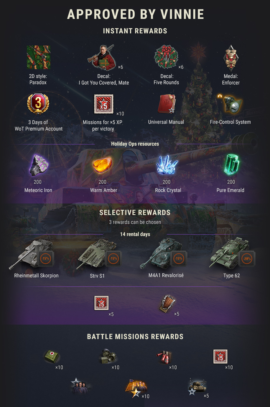 Prime Gaming joins the fun as we celebrate Holiday Ops and delivers a pack of content to fill your festive collection. Claim the Approved by Vinnie package to receive a new 2D style and customization elements, all inspired by the FA Cup-winning actor. All this is topped with 3 days of WoT Premium Account, Experimental Equipment, and 200 resources of each type from Holiday Ops! The package will be available until January 17, 2024.